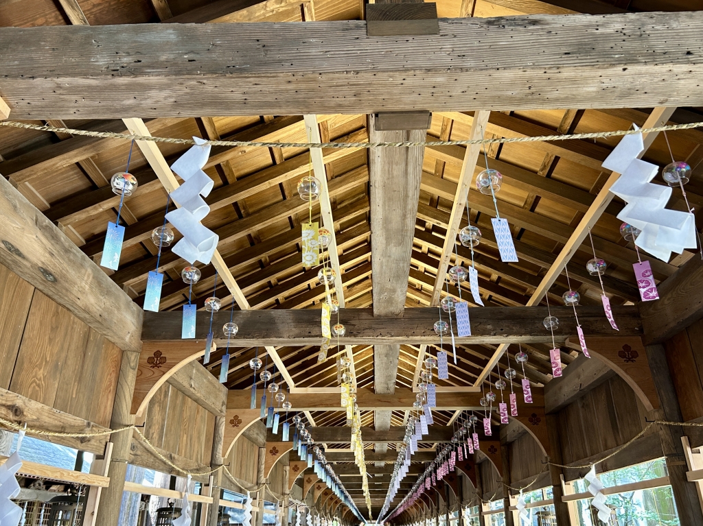 長野県にある諏訪大社上社本宮を訪れました。入口の御門「布橋」には風鈴が飾られ、美しい音色が涼やかさを演出し、ひとつの場をつくり出していました。
