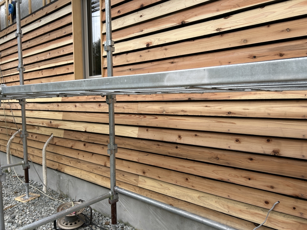 板材は季節や気候によって伸縮するため、外壁材を貼る前に重なり部分を作業場で事前に塗装しておく必要があります。その工程を終え、現在は外壁材が着々と貼り進められています。