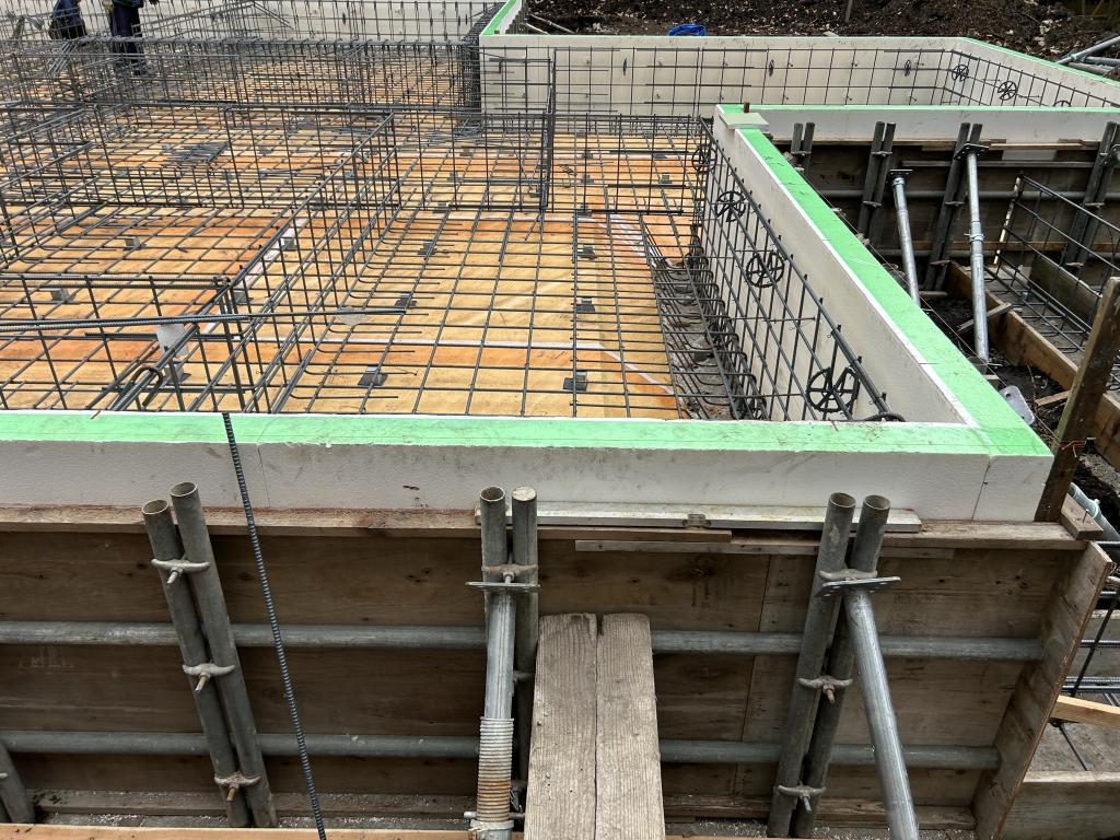 「華明の家」では、基礎工事が進み、昨日、設計者による全数鉄筋検査を実施しました。鉄筋径や本数が異なる箇所や、鉄骨階段を含む少々複雑な基礎ですが、設計図書どおりに丁寧かつ美しく施工されており、無事に「適合」といたしました。設計検査では、断熱材の厚さ・種類、鉄筋の径・間隔・被り厚さ・継手長さなど、多岐にわたる項目を細かく確認します。さらに、アンカーボルトやホールダウンボルトの位置もしっかりと確認し、木造部との確実な接合が行えるよう入念にチェックを行いました。寒さが増す前に基礎工事を終えるため、天候を見ながらスケジュールを調整し、コンクリートの打設も余裕をもって進めています。いつもながら、現場の皆さんによる丁寧な基礎工事に心より感謝いたします。