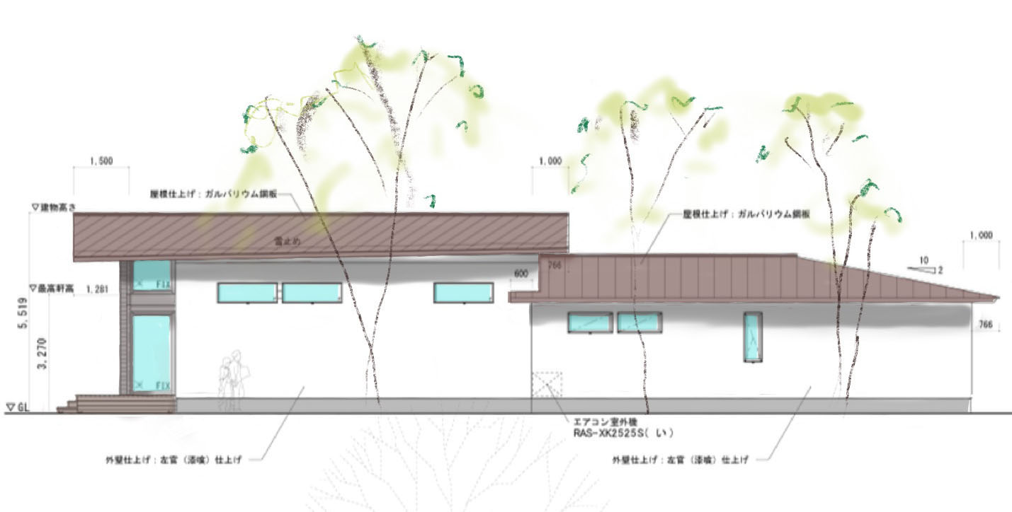 建て主さんとの会話の中で「青山(せいざん)」という言葉を大切にされていることを伺いました。青山には、「樹木がおおいしげる」という意味とともに、「故郷を離れ志を果たす」などという意味があるそうです。その言葉が、この場所の空気や、建て主さんと重なり合い、住まいの輪郭が少しずつ浮かび上がってきました。軽井沢の自然に寄り添い、この場らしい佇まいとなるように計画を進めました。「樹木がおおいしげる」環境と穏やかに調和する建築として、本計画を「中軽井沢青山居(なかかるいざわ せいざんきょ)」と名付けました。
