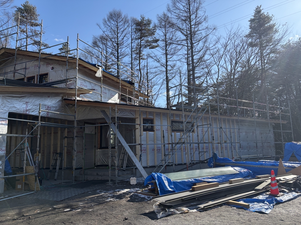お正月明けから断熱工事が進み、付加断熱105mm、充填断熱120mmの施工が完了しました。まだ屋根断熱工事は残っていますが、外気温が氷点下2桁近くまで下がる厳しい環境の中でも、室内の体感は明らかに改善されており、断熱性能の効果を実感しています。外部では、工場であらかじめ塗装を施した外壁材が現地に搬入され、現在、軒天井工事から外壁工事へと工程が進んでいます。一つひとつの工程を丁寧に積み重ねながら工事を進めています。