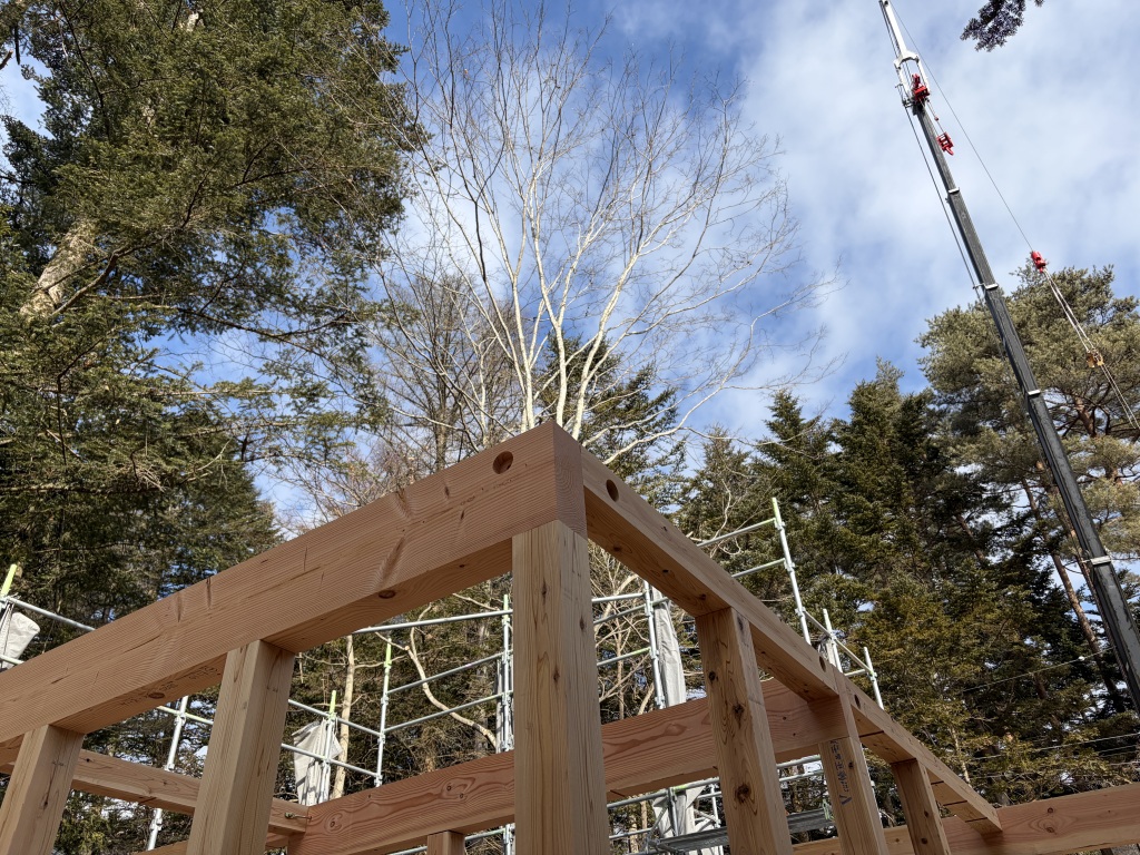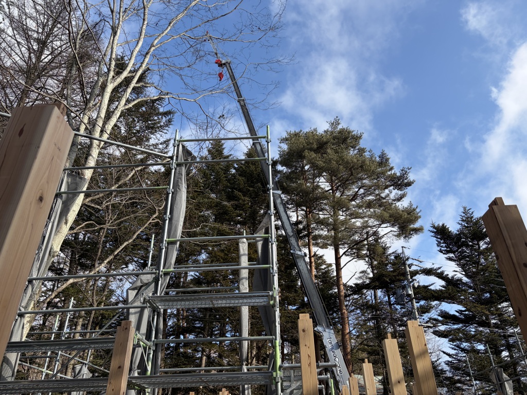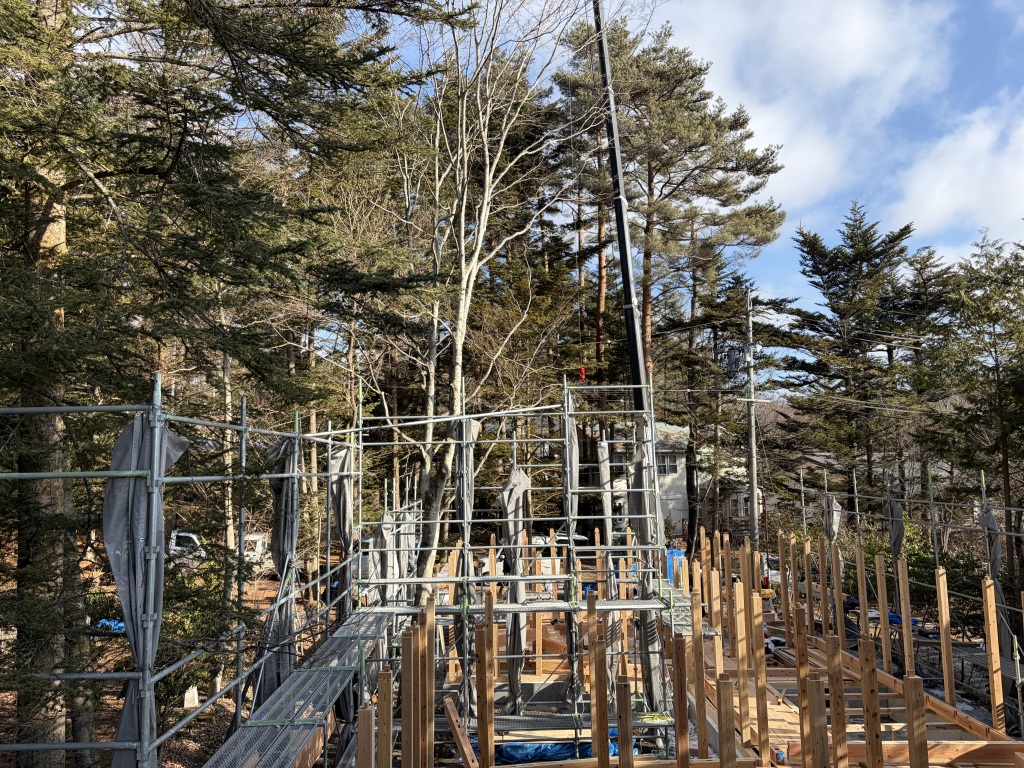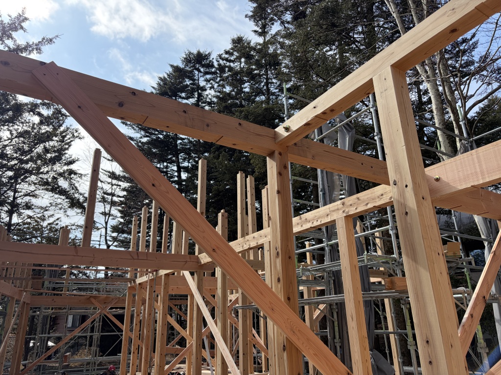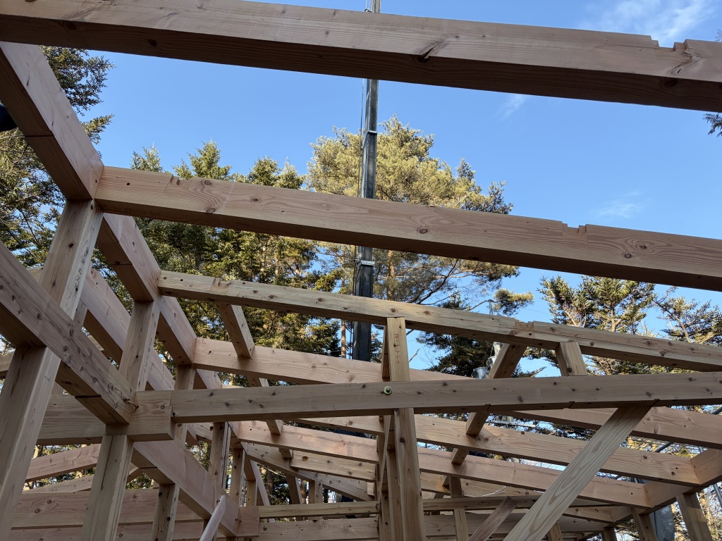「中軽井沢青山居」、晴天の中、無事に上棟いたしました。多くの職人さんにお集まりいただき、複雑な骨組みにも関わらず、手際よく、安全に工事を進めていただきました。ありがとうございました。